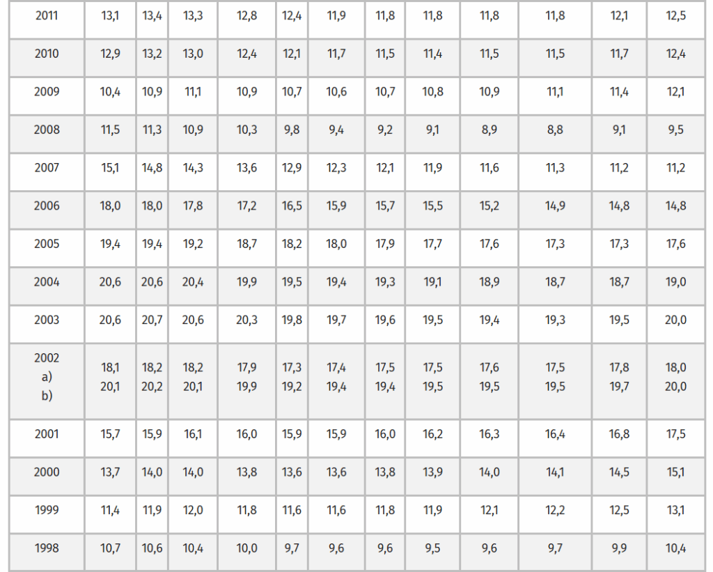 W roku 1999 wchodziła w Polsce reforma ubezpieczeń społecznych i ZUS rekrutował ludzi. Skorzystałam z tej superoferty! A to była naprawdę niezła oferta w pracy w czasach wysokiego bezrobocia. Poniżej stopa bezrobocia w Polsce w latach 1998-2011 (wiersze-lata, kolumny-miesiące)